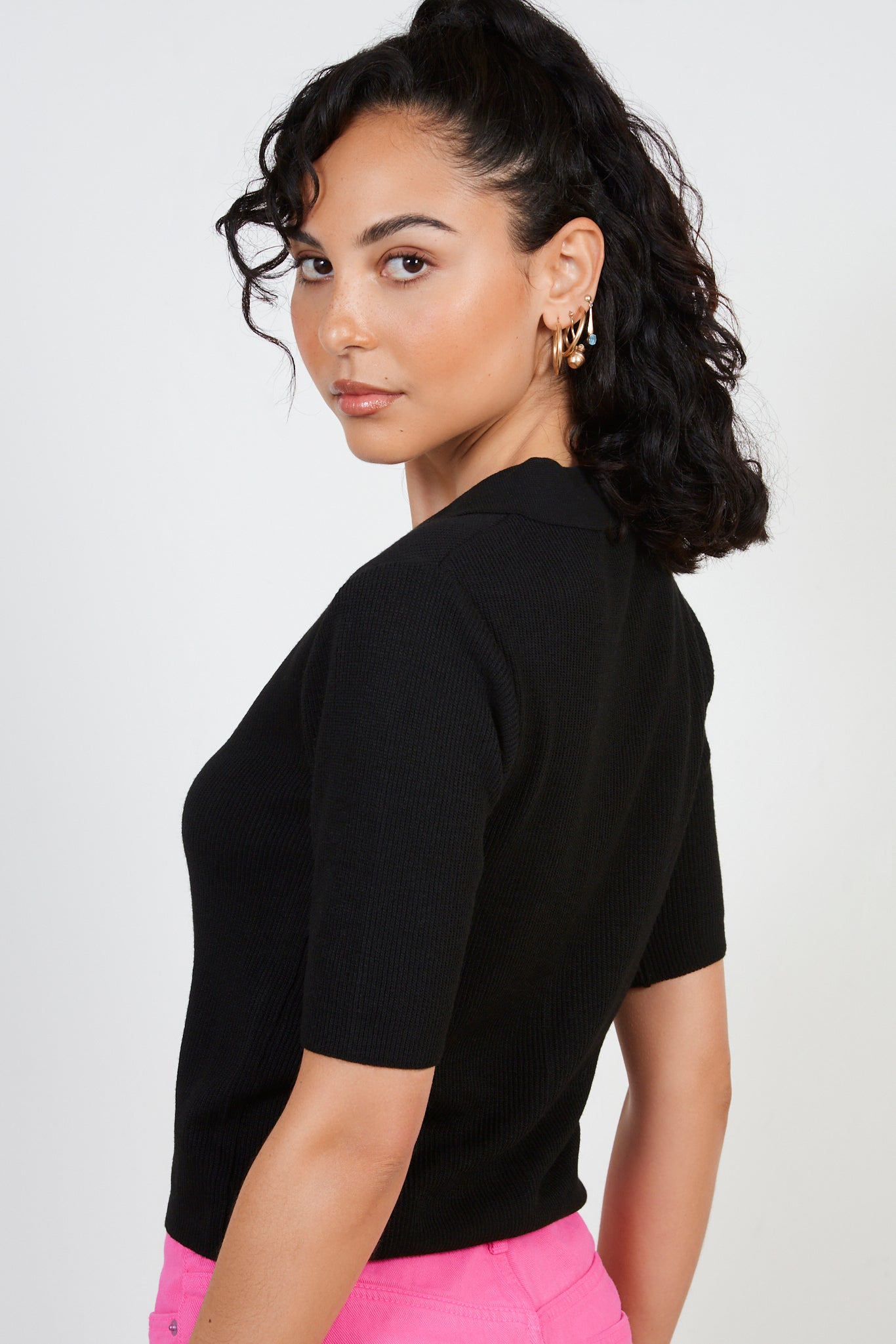 Black button front polo knit top
