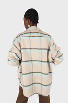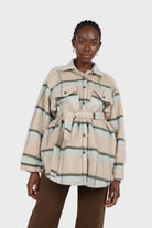 Beige and mint plaid wool blend belted shirt jacket