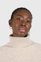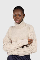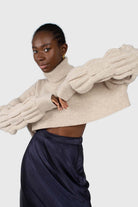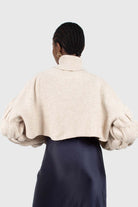 Beige balloon sleeved cropped wool blend turtleneck top