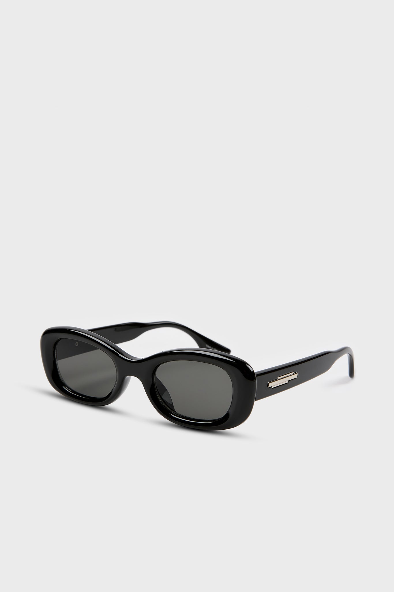 These sunglasses feature a bold thick sloping rectangular silhouette in black, offering a modern and subtly statement look.