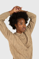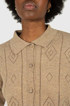 Beige patterned wool-blend knit polo top