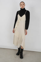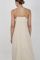 Beige thin strap asymmetric ruffle midi slip dress
