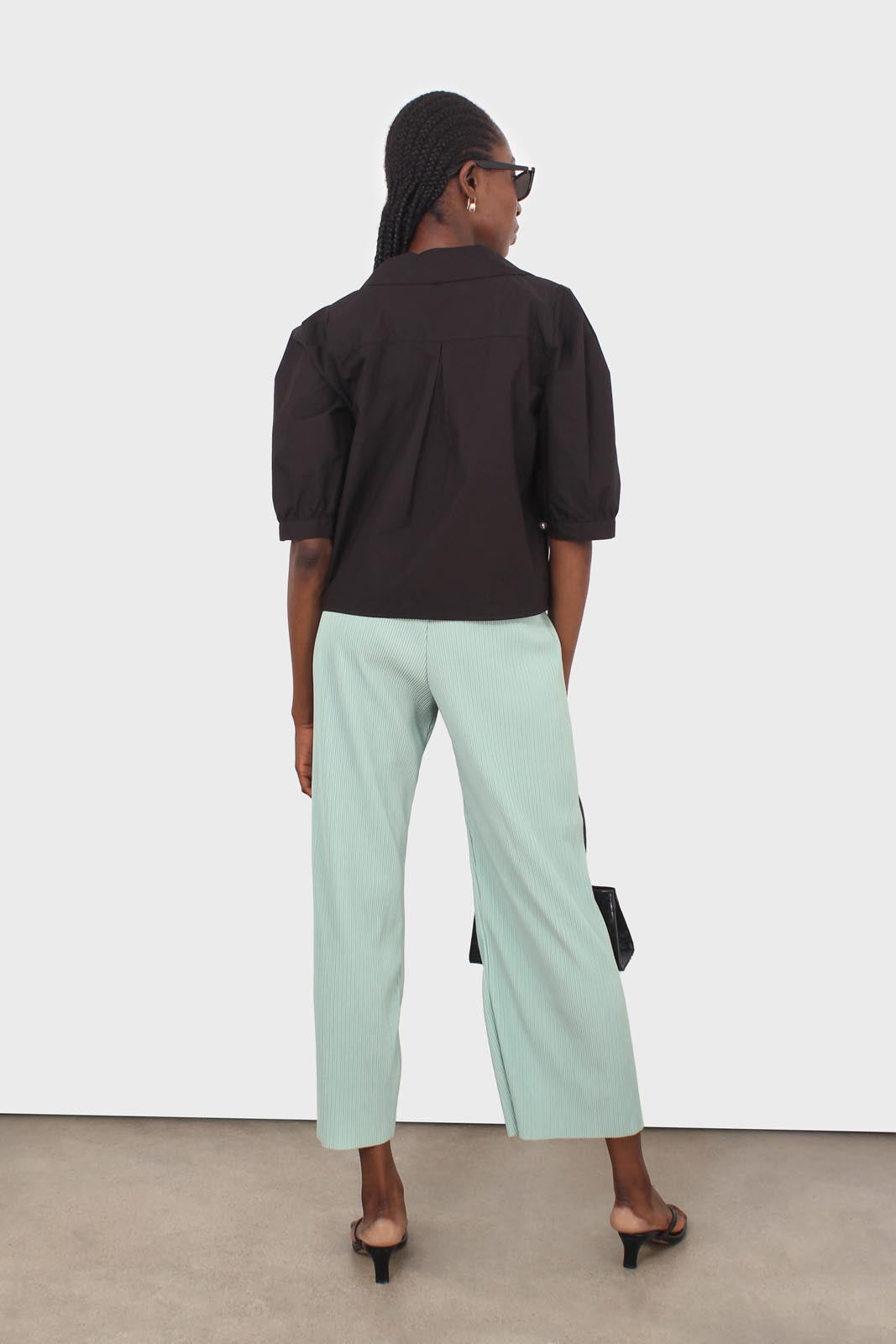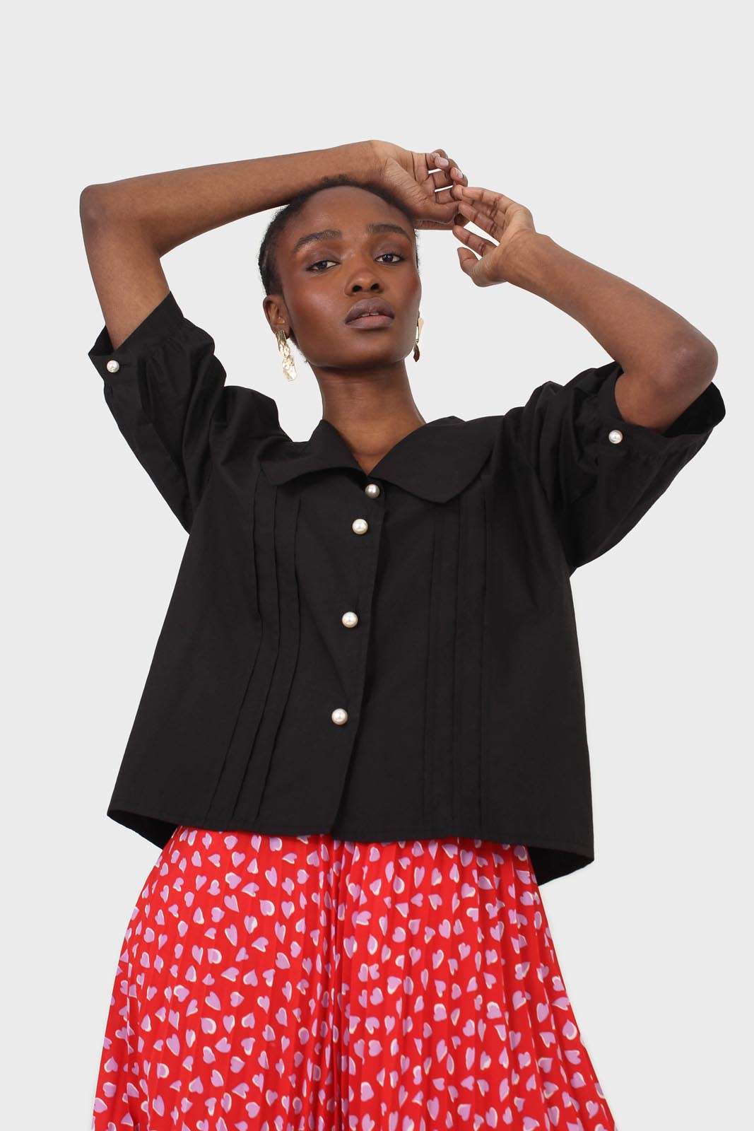Black large collar pleated 3/4 sleeve pearl button blouse