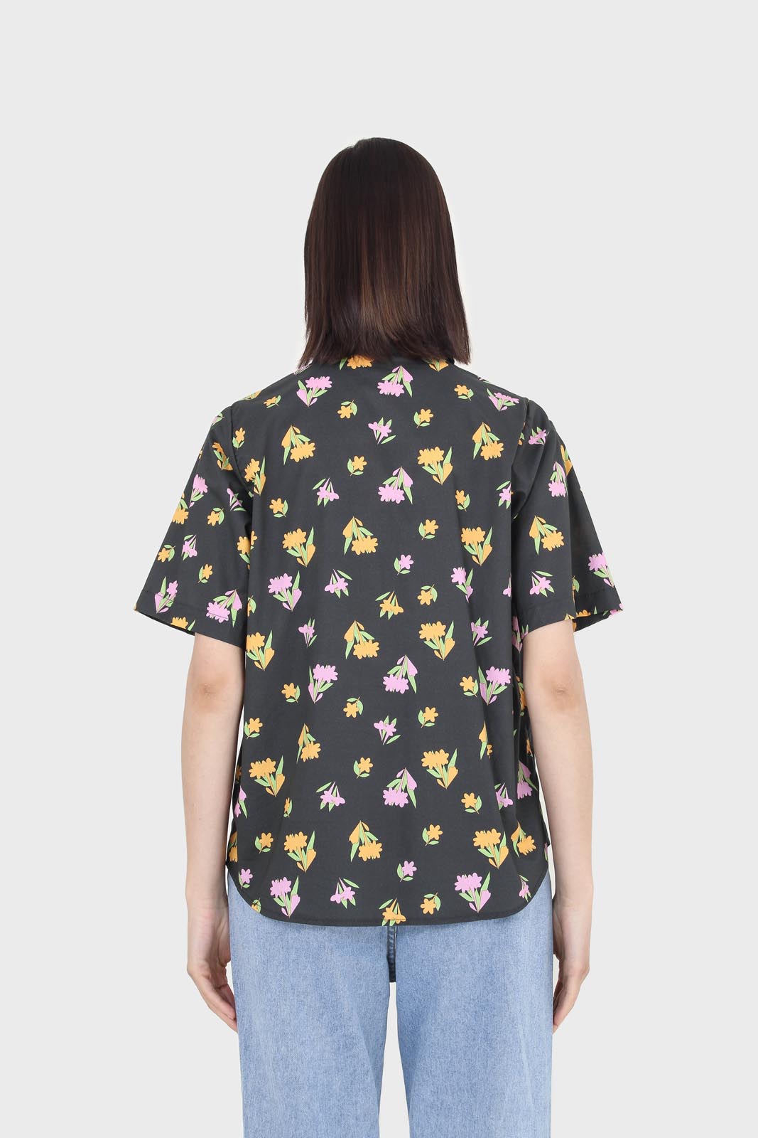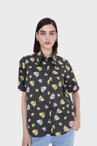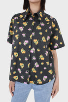 Black large pointed collar floral graphic print shirt