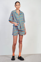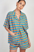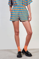 Blue and orange diamond print shorts
