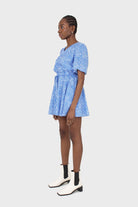 Blue and white floral print tie waist romper