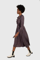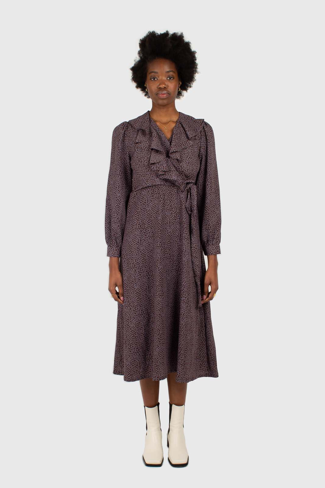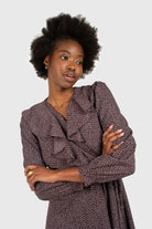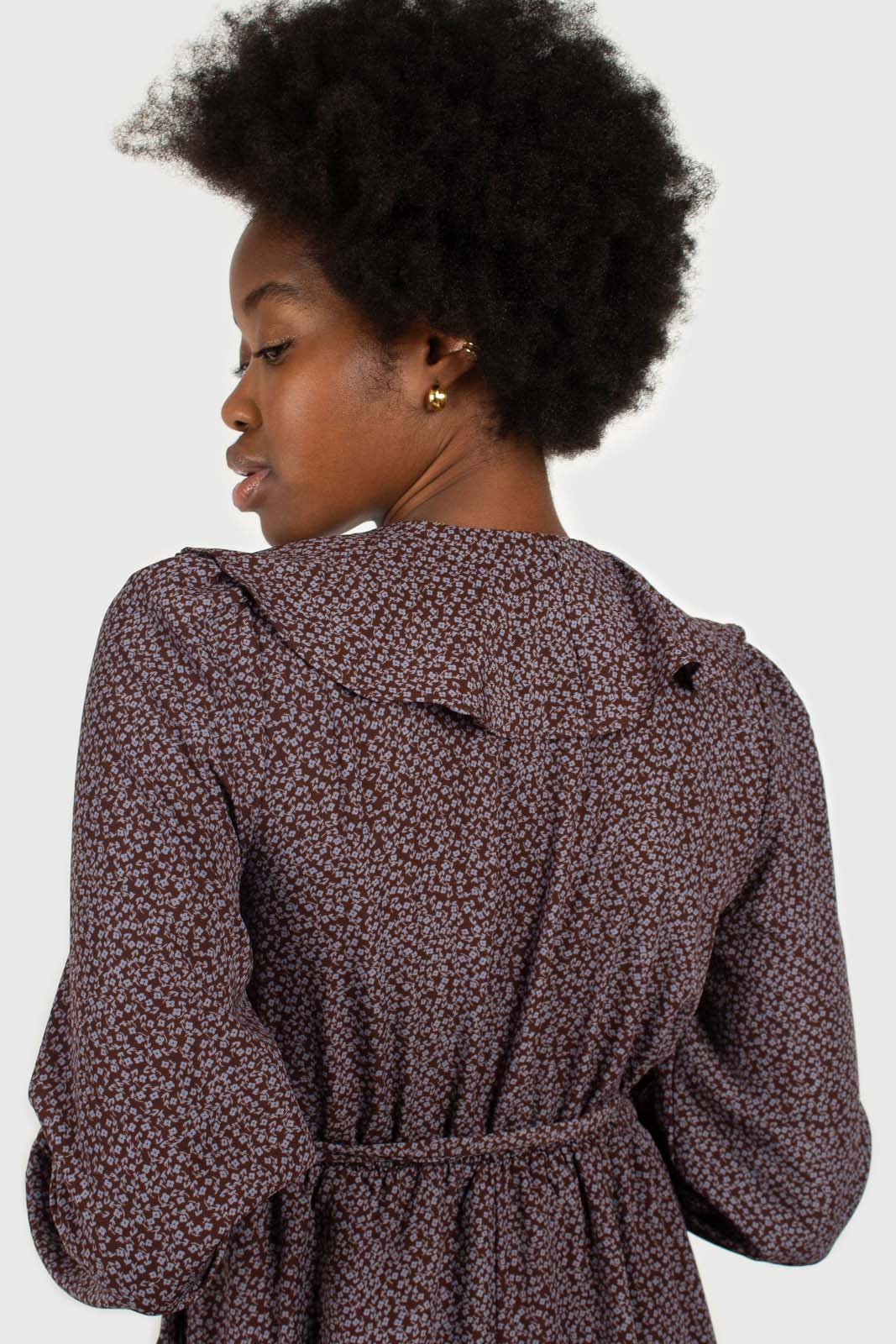 Brown and blue floral ruffle v-neck long sleeved maxi dress