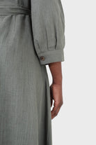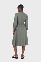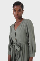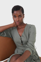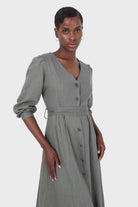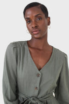 Khaki V-neck button front belted linen dress
