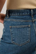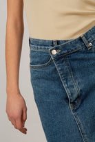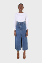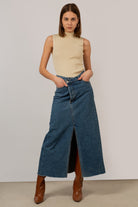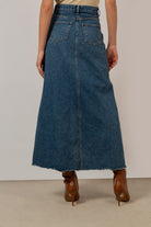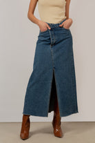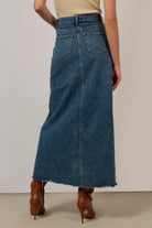 Mid blue denim front slit maxi skirt
