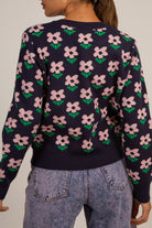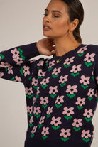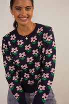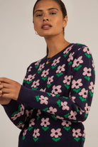 Navy and lilac smooth intarsia flower jumper