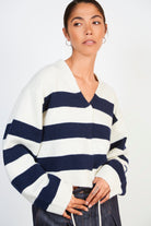 Navy and white alpaca wool blend block stripe cardigan
