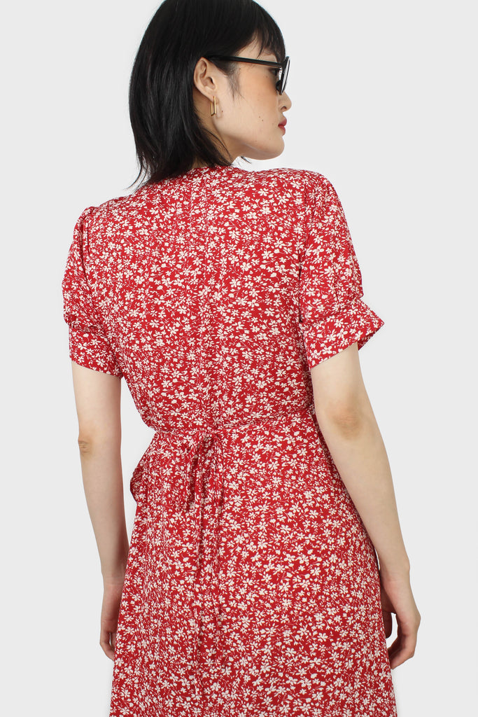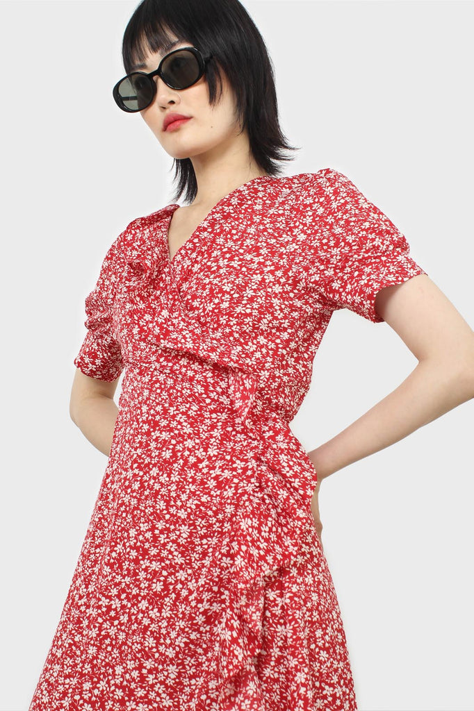 Red and white tiny floral wrap ruffle midi dress