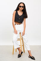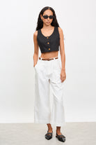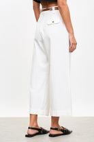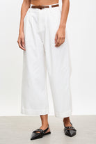 White pleated brown belted trousers